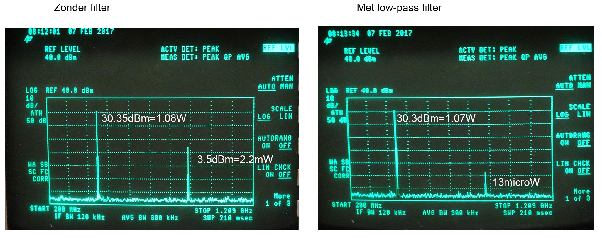 To check the efficiency of the filter, a spectrum analysis was performed. Tx power at the ground frequency was unaffected (1 Watt) while the harmonic was reduced from 2.2 milliWatt to 13 microWatt.